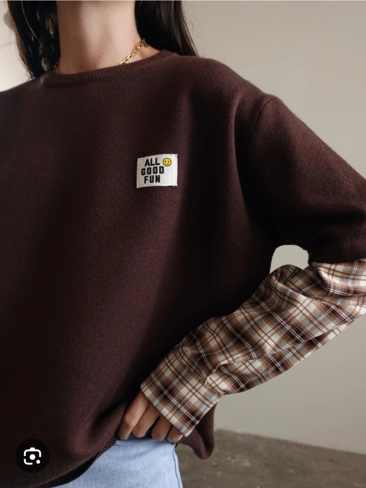 Стилна и удобна блуза в универсален размер, изработена от мека и приятна материя. Моделът е в тъмен кафяв цвят с вградени ръкави от каре, създаващи модерен „layered“ ефект. Подходяща за ежедневието и за по-небрежни визии. Малък надпис отпред с позитивно послание добавя свеж акцент.